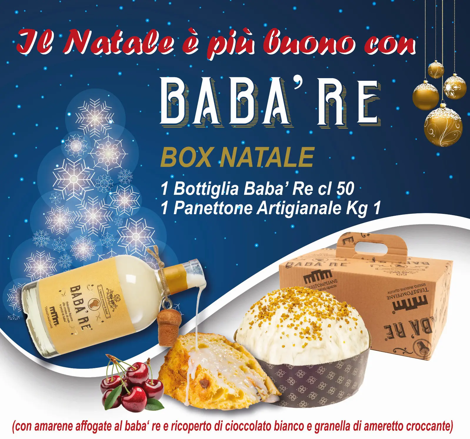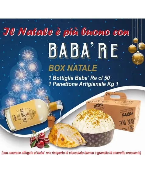 Confezione natalizia composta da bottiglia di Babà Re da 50 cl 1 Panettone artigianale da 1 kg con amarene affogate al Babà re e ricoperto da cioccolto biaco e granella di amaretto croccante